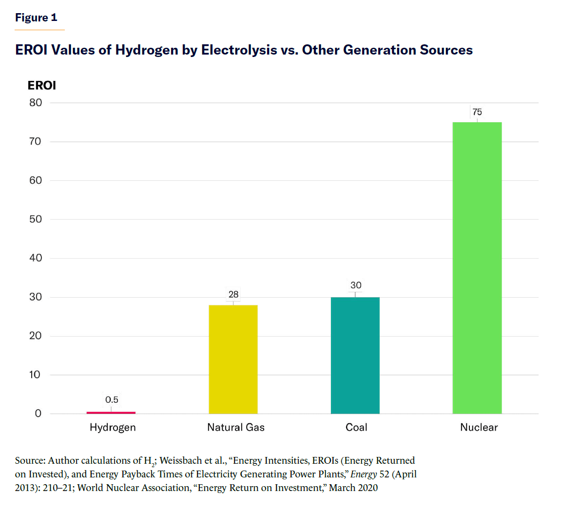 Given these facts, the ineluctable conclusion is that all hydrogen-related subsidies are best abandoned. Instead, the focus should be on streamlining the process for licensing new nuclear plants—especially, small, modular ones—and investing in research and development efforts to reduce the cost of those nuclear plants. These plants will be scalable, will not require costly backup and storage, and can be sited near load centers, thus avoiding costly transmission system upgrades. Finally, in addition to producing emissions-free electricity, nuclear plants have the highest EROI values of any existing energy resource, a critical factor if the world’s increasing demand for energy is to be met cost-effectively.