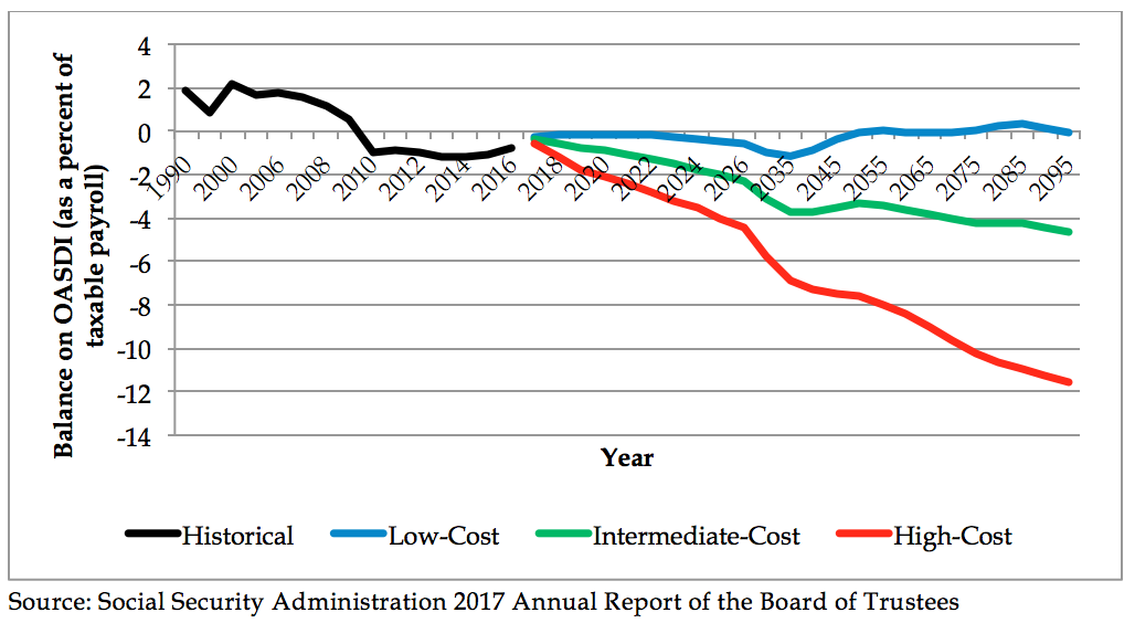The Social Security Administration’s annual trustees’ reports present actuarial data on the present and future financial stability of the OASDI Trust Funds. The latest report, published in 2017, presents a range of scenarios with different levels of immigration.