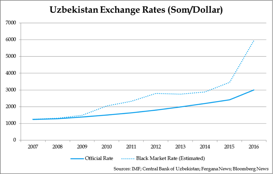 It would also force the Uzbek central bank to keep the official exchange rate in line with the market rate: allow anyone to buy dollars for som through official channels at a below-market price, and the central bank will quickly run out of dollars.