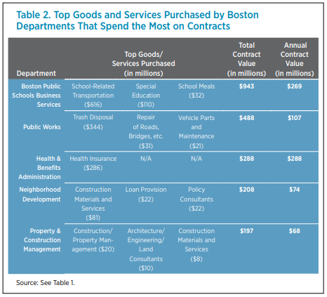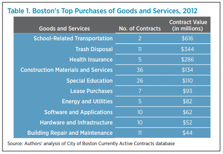Table 1 shows that Boston’s largest categories of purchases include school transportation, trash disposal, health insurance for city employees, construction materials and services, and special-education services.2