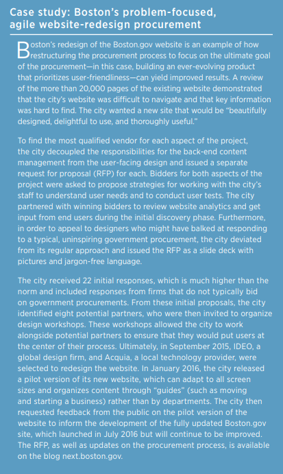 Problem-based procurement: One relatively new approach that governments are using when they are unclear about the optimal solution to a problem is to provide a description of the problem and to seek ideas for solving that problem through what’s called a problem-based procurement. This approach is in stark contrast to the traditional practice of specifying requirements in as much detail as is possible, which can trap governments into old ways of doing things. This problem-based approach is particularly appropriate when the key challenge is to discover the right idea—as is often the case with technology or design. San Francisco, for example, created the Startup in Residence (STIR) program, in which government agencies identified challenges related to housing, transportation, the environment, and public safety. Competitively selected start-ups were then embedded in agencies for 16 weeks to create a new product or service, usually involving a software solution or a mobile app that solved a particular challenge posed by the agency. Start-ups then have the possibility of entering into a paid contract with the agency. Since its initial launch in 2014, STIR has been expanded to include Oakland, San Leandro, and West Sacramento. Current projects include improving the process of recruiting foster parents using a mobile app with the San Francisco Human Services Agency; enabling city engineers and inspectors to record building-safety assessments after an earthquake with the San Francisco Public Works Department; and helping West Sacramento police officers connect homeless individuals to resources and social services, including vouchers for transportation, food, or shelter, using a mobile app.