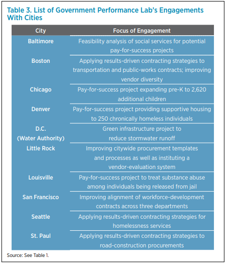 Yet most cities treat procurement and contract management as back-office functions rather than as key strategic activities. Even simple procurements get tied up in red tape and can take months to accomplish. Many contracts are renewed at the last minute, without consideration of past performance. Contract management consists largely of processing invoices and change orders, with little attention paid to monitoring quality. Vendors are rarely challenged to improve outcomes. Since 2011, the Harvard Kennedy School Government Performance Lab has been providing pro bono technical assistance to state and local governments in an effort to understand how governments can improve their contracting and procurement. As part of Bloomberg Philanthropies’ What Works Cities initiative, we are helping 20 cities across the country implement “results-driven contracting” strategies.