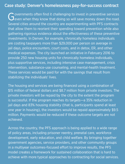 Pay for success (PFS): PFS contracts make a portion of payment contingent on outcomes. Governments like PFS contracts for three primary reasons: they can help reorient their budgets toward preventive services and away from remedial costs; they diminish the chance that ineffective programs will continue to receive funding; and they can provide a framework for multiyear collaboration with service providers to reengineer systems to improve results. In the most rigorous PFS contracts, there is often a multiyear delay between when services are delivered and when outcomes can be assessed and payments made. In these cases, private investors provide the operating capital for the service provider in exchange for the rights to the future success payments—a structure known as a “social impact bond.” To date, two of the cities we have helped have launched PFS contracts backed by social impact bonds. In Denver, this approach is being employed to provide supportive housing to 250 chronically homeless individuals (see case study). In Chicago, a PFS contract is being used to expand high-quality preschool education. We are currently working on PFS projects with four addi- tional cities in policy areas ranging from addiction treatment to green