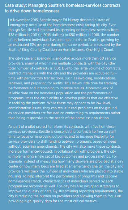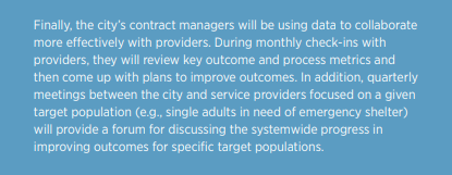 4. Achieving better outcomes from human-services contracts. Cities have a difficult time seeing the connection between spending on social services and progress in addressing major social problems. Take homelessness. Cities often find that they are spending more and more on services, yet there seems to be an increasing number of people sleeping on the streets. One problem is that there are often multiple funding sources tackling a given social problem, with little coordination to ensure that overall funds are efficiently allocated and that no needy person falls through the cracks. A second problem is that cities often fail to track the results of the services with meaningful metrics. At best, cities monitor processes, such as how many beds were occupied at an emergency homeless shelter. It is rare for cities to track outcomes, such as how many individuals were placed in stable housing. As a result, cities are unable to determine if their services are ultimately mitigating social problems. Furthermore—partly because of the lack of real-time data on pro- gram performance—cities are not monitoring whether service providers are delivering effective services, or collaborating with them to improve performance during the course of their contracts.