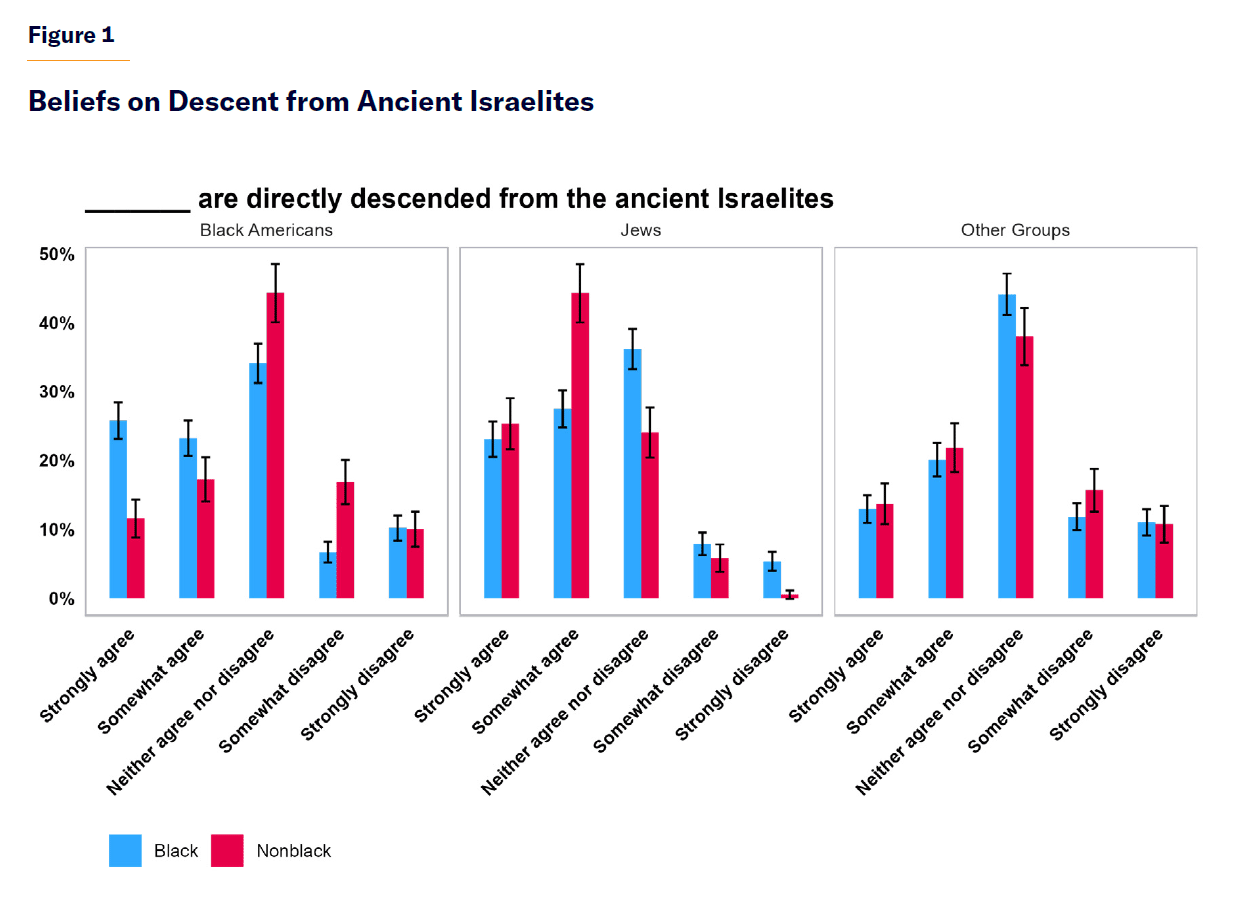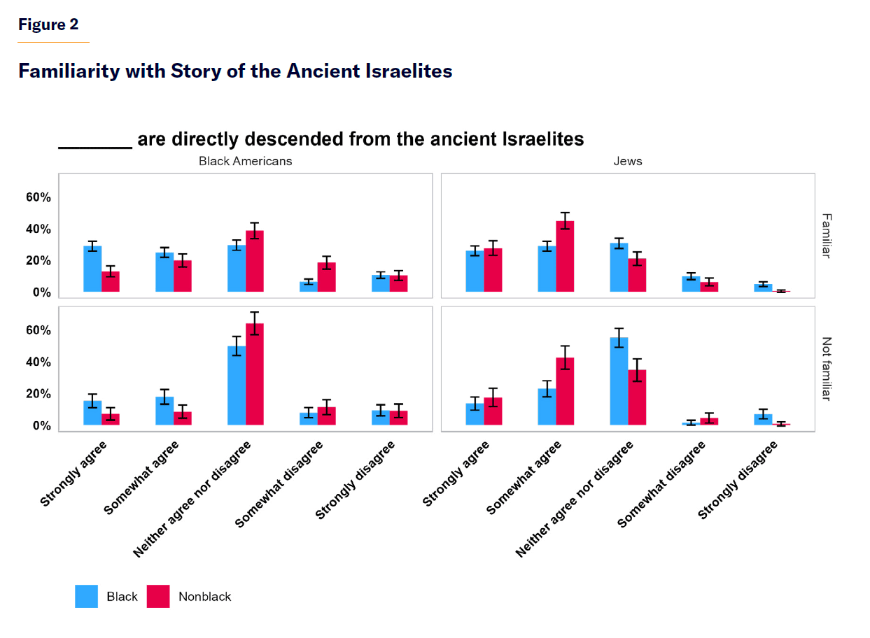 One issue with these estimates is that 22% of both samples report being unfamiliar, to some degree, with the story of the ancient Israelites. Among those who said that they lacked familiarity, 33% of the black sample and 15.6% of the nonblack sample nonetheless said that they believed that black Americans were descended from the ancient Israelites.