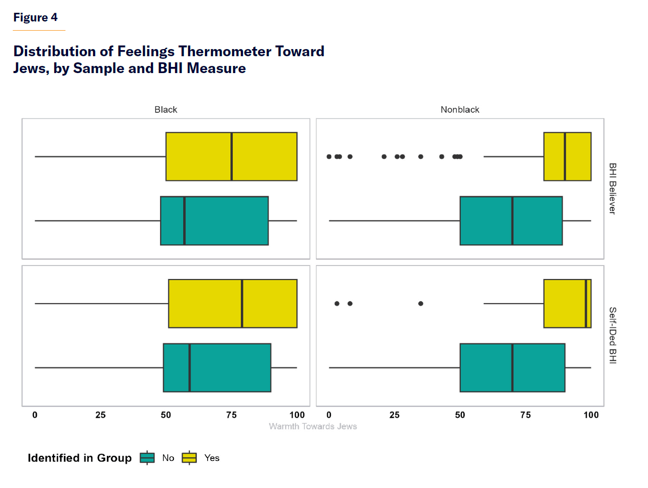 It is also possible that agreement with antisemitic beliefs does not necessarily measure explicit enmity toward Jews. Respondents may agree that Jews were involved in the slave trade or that Jews have too much power, without necessarily feeling (or at least expressing) intrinsic negative affect toward Jews. A corollary of this explanation is that some respondents may simply be more inclined to agree with statements of radical or extreme views of all kinds—both antisemitic beliefs and BHI beliefs themselves—while simultaneously being more warm in their expressed feelings toward other groups.