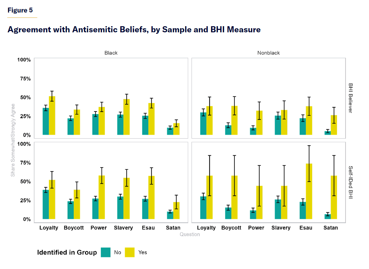 What about the antisemitic belief questions? Rates of agreement with all six statements for BHI believers/identifiers are depicted in Figure 5. In general, across both samples, both BHI groups are significantly more likely to somewhat or strongly agree with the various antisemitic statements. The results on the two beliefs sometimes associated particularly with BHI thought—that Jews are descended from Satan, or that Jews are descended from Isaac’s brother, Esau—are independently notable. Only minorities of “BHI believers” assented to these views. A majority of nonblack respondents who IDed as BHI (a very small group) said yes to both, but black self-IDed BHI were much more likely to say that they believe that Jews were descended from Esau than from Satan.