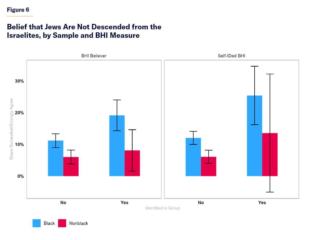 One antisemitic belief that is not included in the analyses above—but is measured by the survey and briefly examined in the last section—is the idea that Jews are not descended from the ancient Israelites in general. As Figure 6 shows, this idea is more common among BHI believers and self-IDed BHIs. A total of 19% of black BHI believers and 25% of black self-IDed BHIs somewhat or strongly believe that Jews are not descended from the Israelites. The equivalent (very imprecise) figures for the nonblack samples are 8.1% and 13.6%.