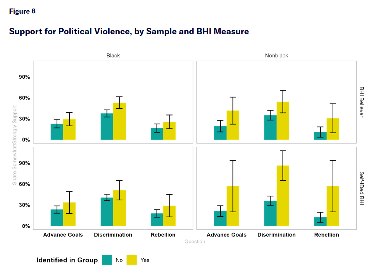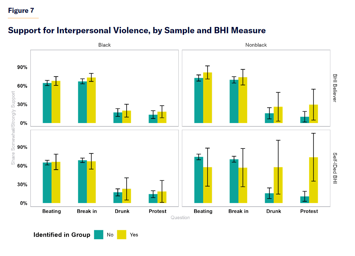 - Profession of BHI beliefs/identification is suggestively associated with greater support for political violence, but it is associated with greater support for interpersonal violence only among nonblack BHI believers.