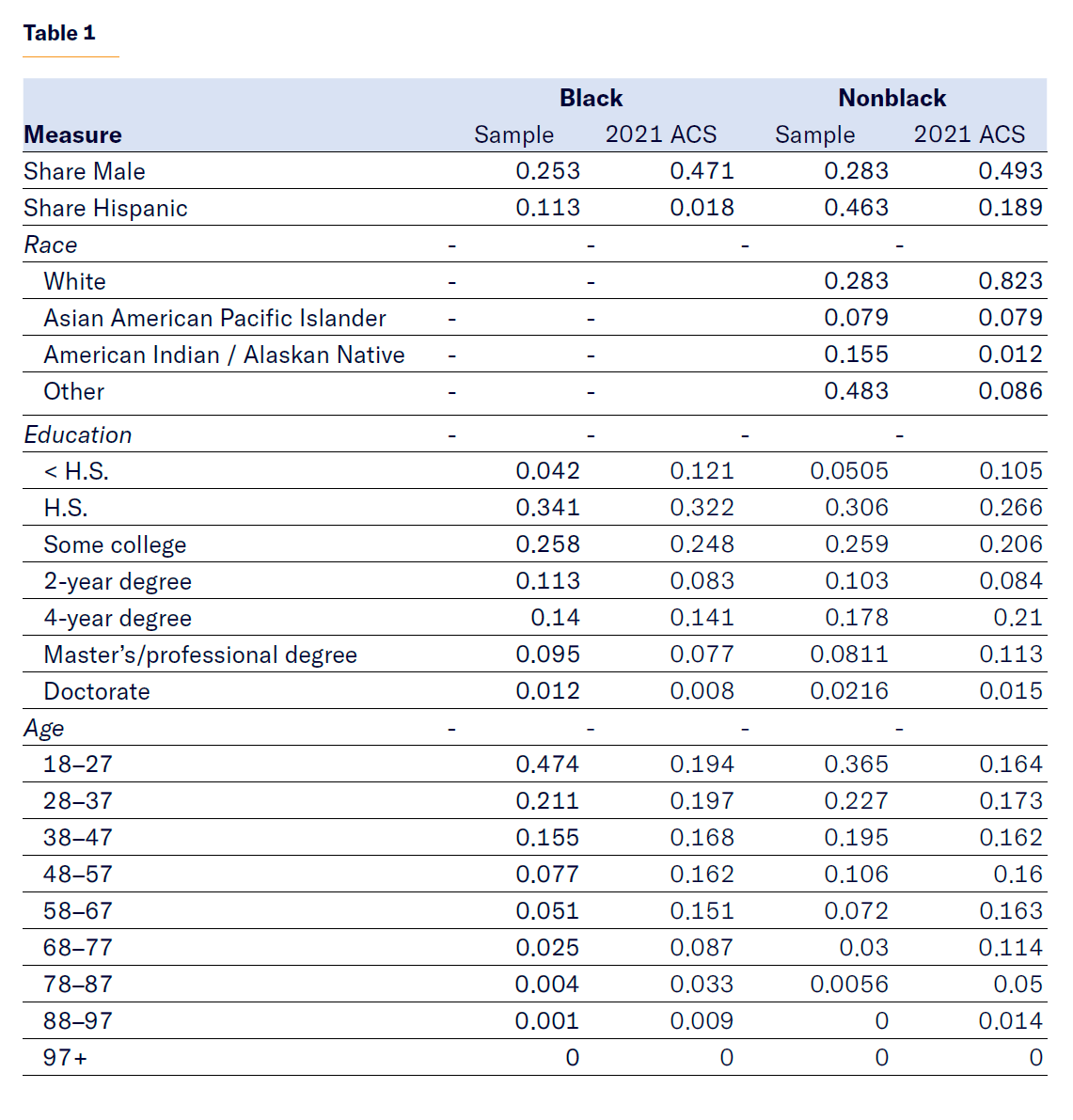 Table 1 provides details on the demographic characteristics of the black and nonblack samples, compared with the same characteristics in the full population from the 2021 American Community Survey, obtained from IPUMS.[31] Both samples differ from the target population on several key dimensions. Both samples are about 25% male, compared with about 50% in the general population; they are also substantially younger and more Hispanic, on average. The nonblack sample is far less white, and far more Native American, than the general population.