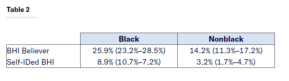 To investigate the extent and correlates of BHI ideology, a survey was fielded on the Qualtrics platform between July 11 and July 14, 2023, collecting a total of 1,630 responses. In that period, responses from 1,075 self-identified “Black or African American” respondents (hereinafter, just “black”) were collected. For comparison purposes, responses from 555 nonblack respondents were collected. These included 86 self-identified “American Indian or Alaska Native,” 44 “Asian or Pacific Islander,” 157 “white,” and 268 “other.” Respondents were also asked if they were of “Hispanic, Latino, or Spanish origin.” A total of 71% of the “Other” respondents identified as Hispanic, versus 14% of the rest of the sample, explaining the high rates of “other” identification in the survey.