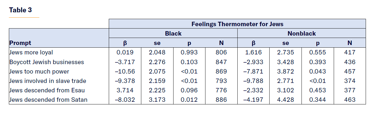 Interestingly, the measures of antisemitism are not universally associated with the feelings thermometer, nor are they associated in the same way across the two samples. In the black sample, three of the measures (“Jews have too much power,” “Jews were more involved in the slave trade,” and “Jews are descended from Satan”) are significantly and negatively associated. Another (“boycott Jewish businesses to criticize Israel”) is marginally significantly (p = 0.103) and negatively associated. Finally, one (“Jews are descended from Esau”) is marginally significantly (p = 0.096) and positively associated. In the nonblack sample, only two of the statements (“Jews have too much power” and “Jews were more involved in the slave trade”) are significantly (p < 0.05) and negatively associated, such that cooler feelings are associated with a higher probability of reporting belief.