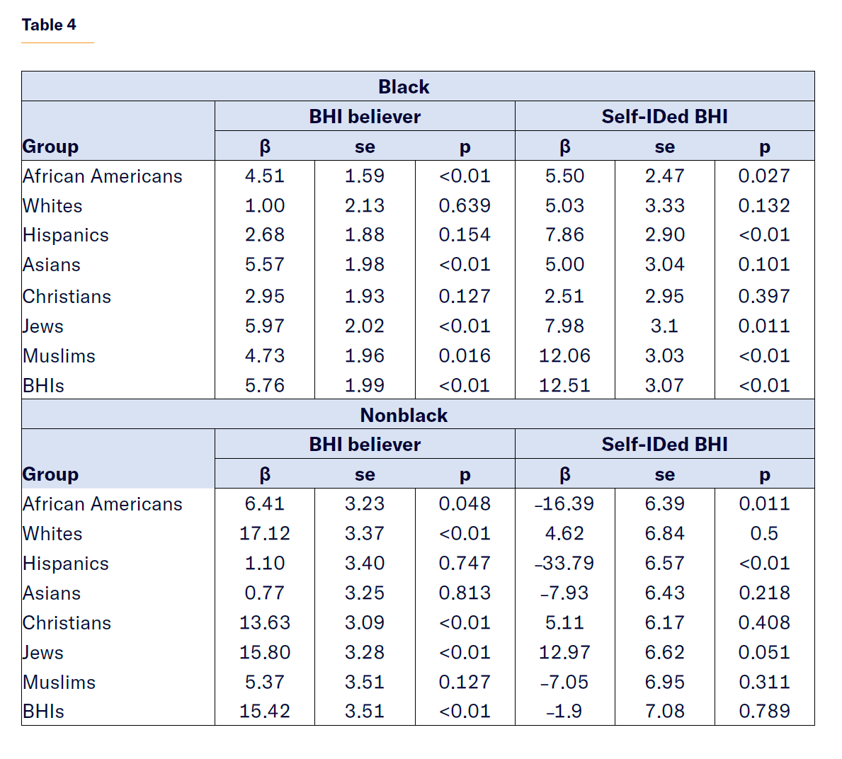 While it may be surprising that 14.2% of nonblack respondents are classified as BHI believers, there is no reason that nonblack people cannot believe that contemporary black Americans are descended from the ancient Israelites.