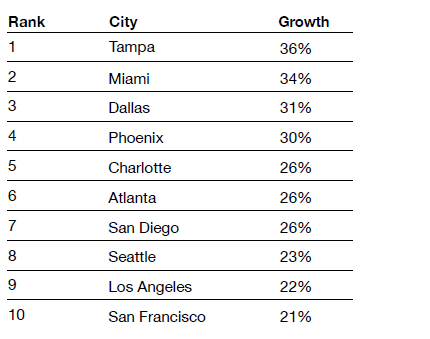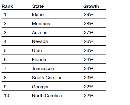 Southern and Mountain West states, as well as many small to midsize cities, have boomed over the past few years as many Americans searched for lower cost of living and a better quality of life. The Covid-era shift toward more remote work may have played a major role in pushing up home prices in areas where lifestyles and housing costs were more amenable than in coastal cities, such as San Francisco.[29] This trend is likely to continue as flexible work arrangements remain popular, millennials begin and raise families, and the ranks of retirees rise.