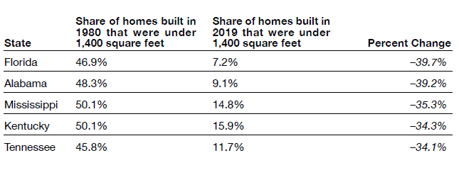 Worse, starter homes no longer exist as a functional category for home builders and, increasingly, buyers, as well. In 1980, 40% of homes being built were entry-level homes (smaller than 1,400 square feet); by 2019, this figure had fallen to just 7%.[10] The largest decreases in starter home production were concentrated in the South, with Florida seeing the largest decrease in starter home production. In 2020, when 2.38 million Americans bought their first home, only 65,000 entry-level homes were built, compared with 418,000 in the late 1970s.[11]