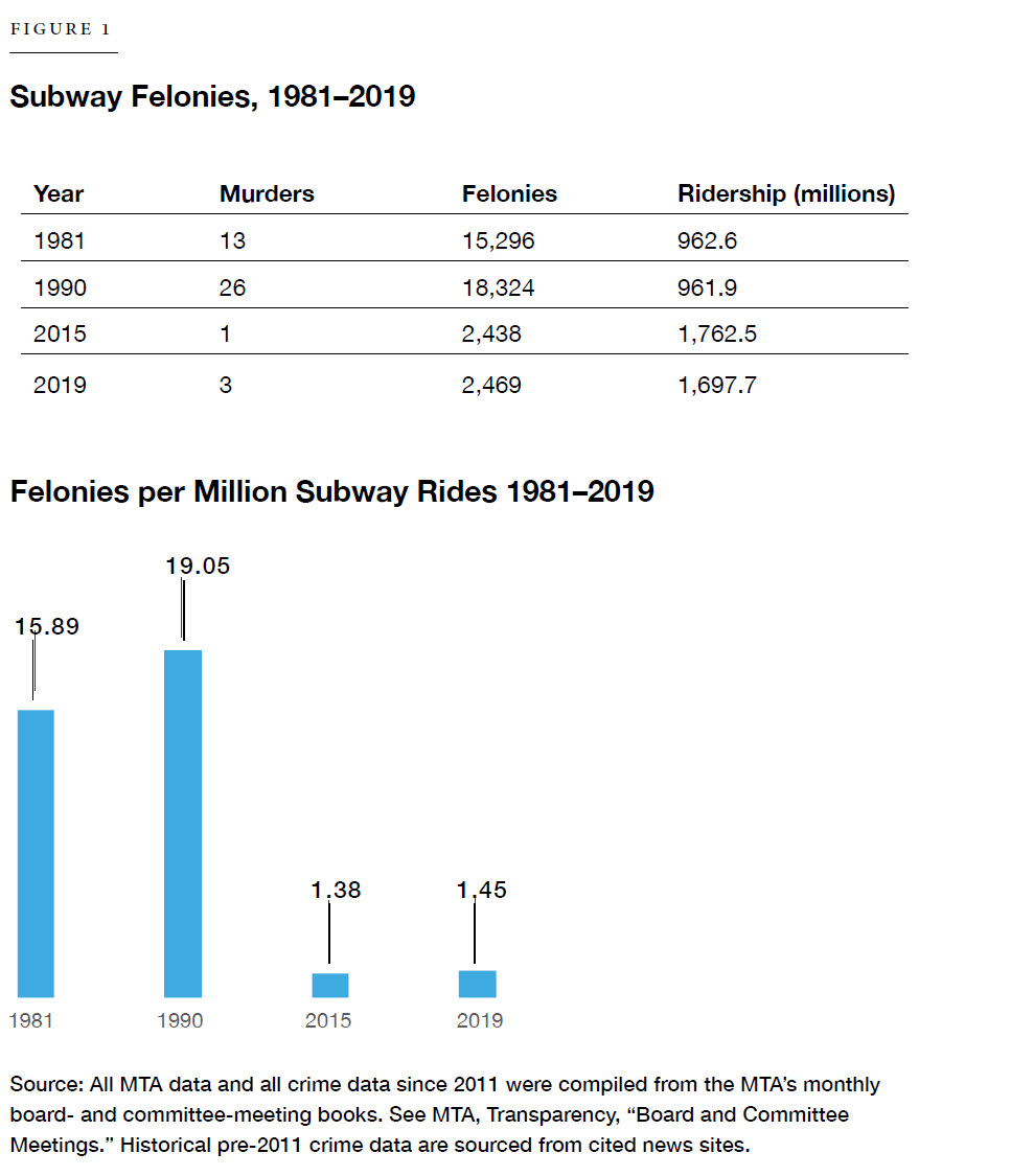 The current level of violent crime on the subways in no way resembles that of the 1980s and early 1990s. In 1990, for instance, 26 people lost their lives to murder, a record high. By the 2000s, this number had consistently fallen to one or two murders annually. With subway system felonies having fallen from 18,324 in 1990 to 2,469 in 2019, the risk of crime victimization fell from 19 felonies per million rides to fewer than 1.5 felonies per million rides, a level not seen since the late 1960s.
