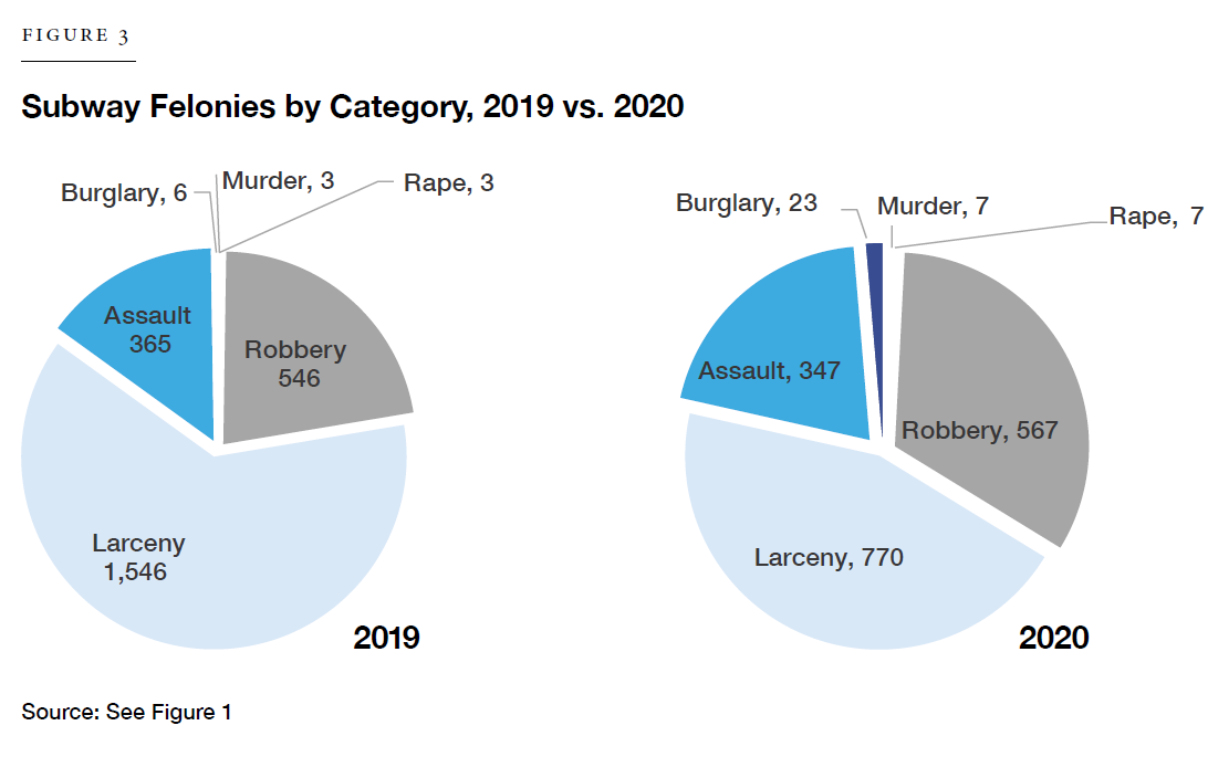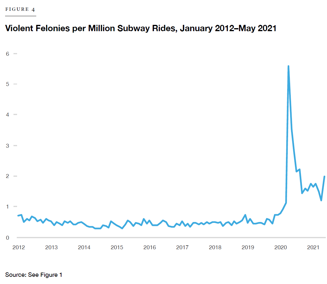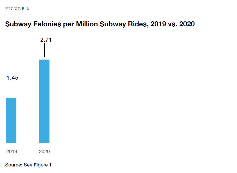 These remarks fail to account for the fact that with ridership so low—as low as 9% of normal in the mid-spring of 2020—the per-capita risk of becoming a victim of a felony (murder, rape, robbery, assault, larceny, or burglary) has increased substantially. The per-capita risk of becoming a victim of a violent felony, in particular, has more than tripled.