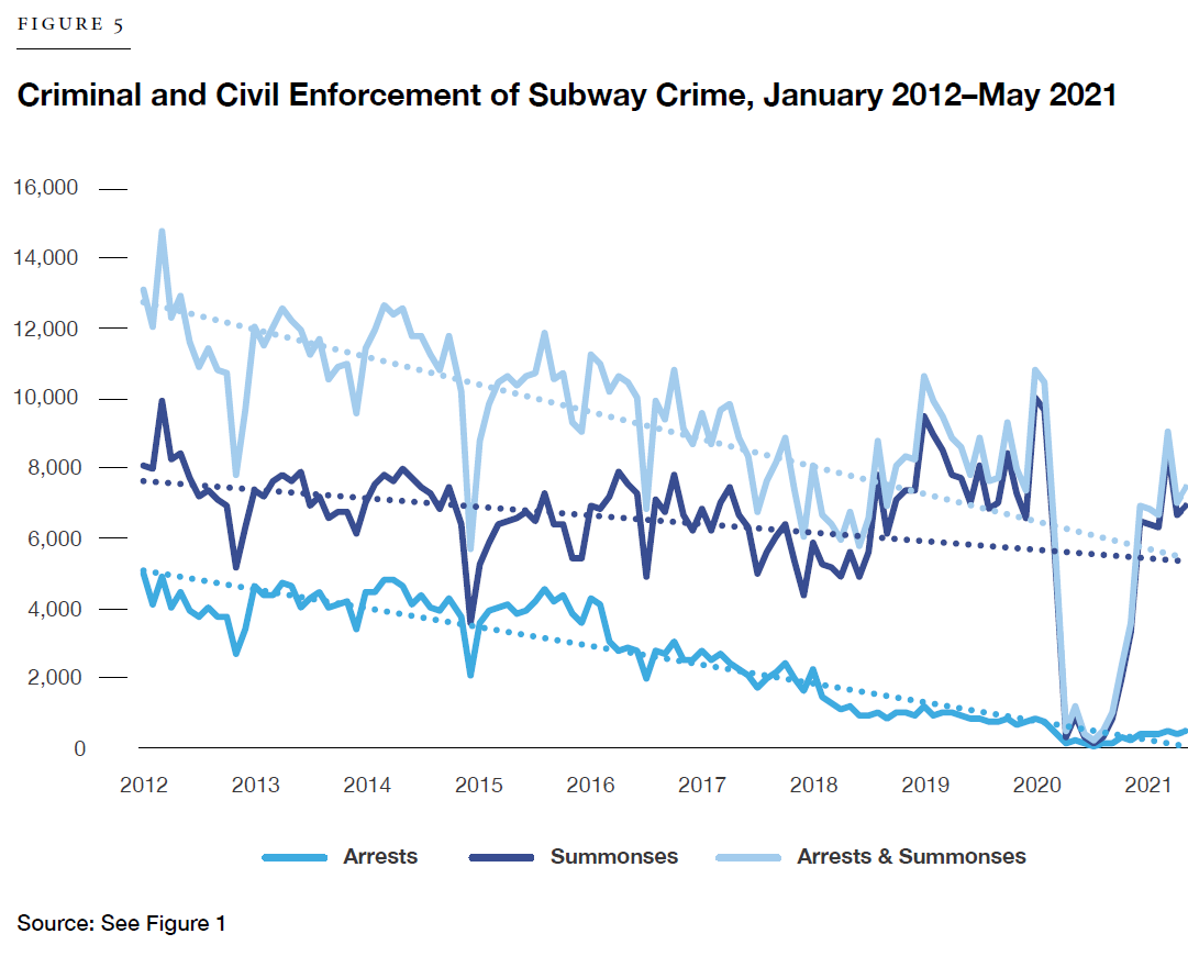 This trend accelerated during the pandemic. In the early months of Covid-19—the spring and summer of 2020—police resources were strained by Covid illness and quarantine as well as diverted to protests and riots. The criminal and civil enforcement of transit crimes fell to nearly nil. From June through September 2020, the police made just nine arrests for fare evasion, down from 850 in the comparable months of 2019. By the early months of 2021, police resumed civil-summons enforcement, albeit at a slightly lower level than in 2019, and arrests remained at modern record lows.