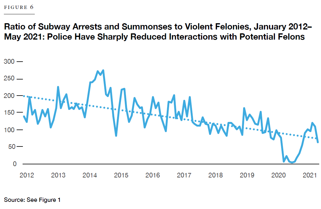 The correlations among ridership levels, civil and criminal law enforcement, and crime levels are complex and not necessarily intuitive. It might seem natural to think that as ridership fell, police interaction with criminal and civil suspects could have fallen commensurately, maintaining an equilibrium of public safety. Yet there is not a 1-to-1-to-1 ratio among ridership, law enforcement, and crime. Because high ridership itself offers some protection against crime, when ridership falls, police enforcement must go up, not down, to maintain public safety. Thus, falling ridership coupled with falling enforcement has equaled higher crime, and the number of arrests and summonses, relative to violent crime, fell significantly during the early months of the pandemic—and during the first five months of 2021, it has settled at a level lower than the pre-2020 norm (Figure 6).