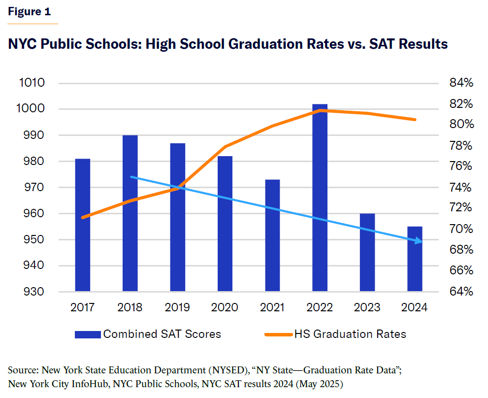 Suppose you want to find out how well New York City public elementary and secondary schools are doing. You might examine recent public high school graduation rates—which increased from less than 60% in 2013 to 80% in 2024, with the number of students receiving an Advanced Regents diploma growing by an even higher percentage: 23% in 2024 vs. 17% in 2013—and conclude that schools have been steadily improving, even excelling.[9] But if instead, you look at SAT participation and scores from the same cohort and period—which have fallen in all but one year since 2018[10]—you would likely get the impression that the same school system is languishing, if not failing (Figure 1).