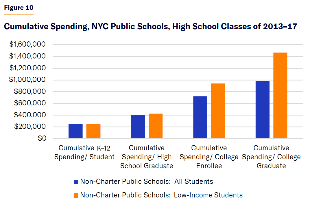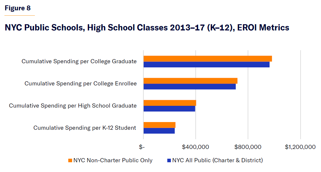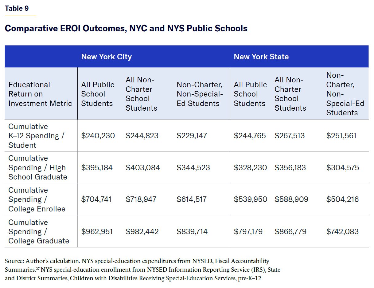 - Excluding NYC special-education students and expenditures from the overall district public school enrollment, spending per college graduate still exceeded $800,000.
