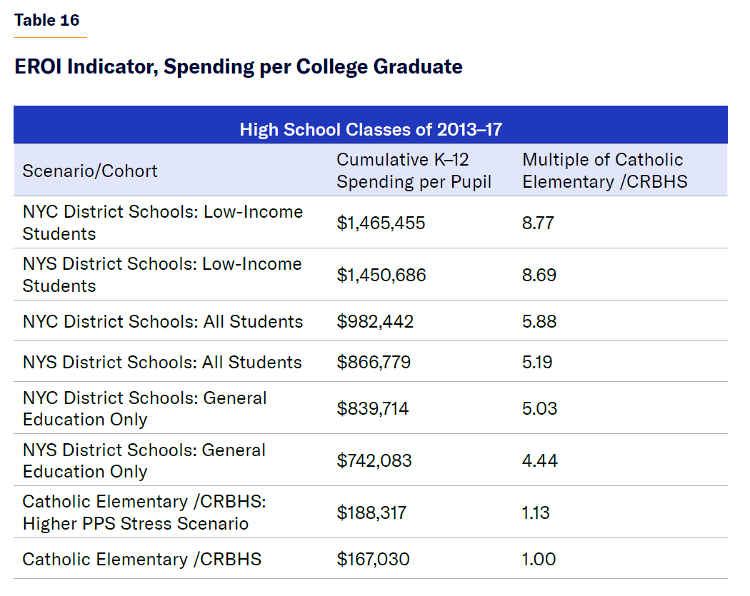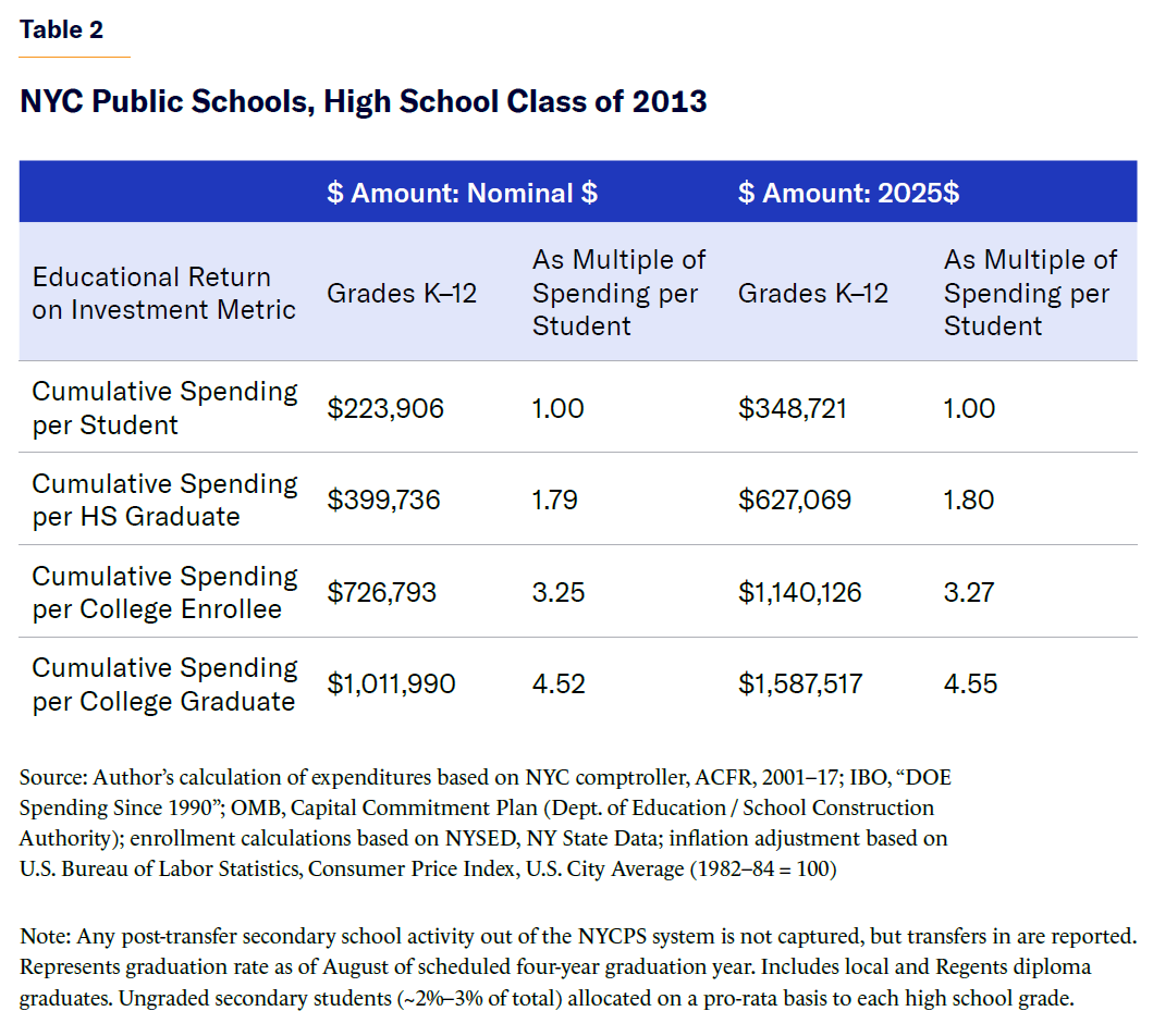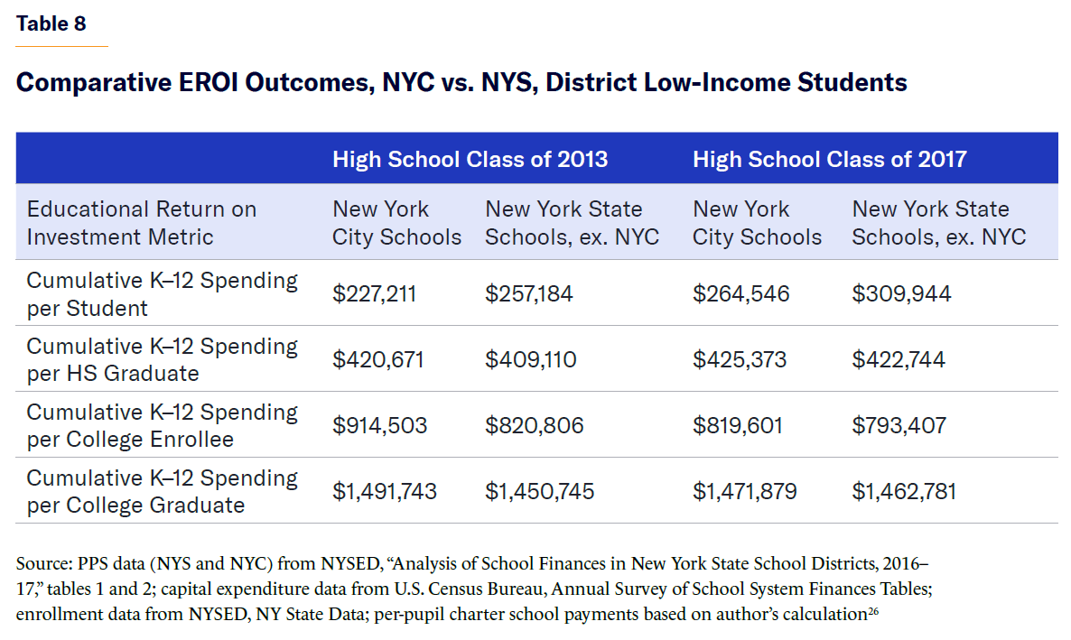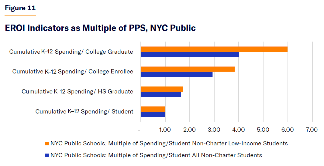 - This total, sizable as it is, pales when student outcomes are factored in by utilizing the EROI approach. To produce one high school graduate with a low-income socioeconomic status costs about $639,000 in today’s dollars. To yield an eventual single associate’s or B.A. degree recipient from that same low-income cohort, the NYC public school system expended approximately six times the amount spent per pupil, $2.2 million in constant 2025 dollars.