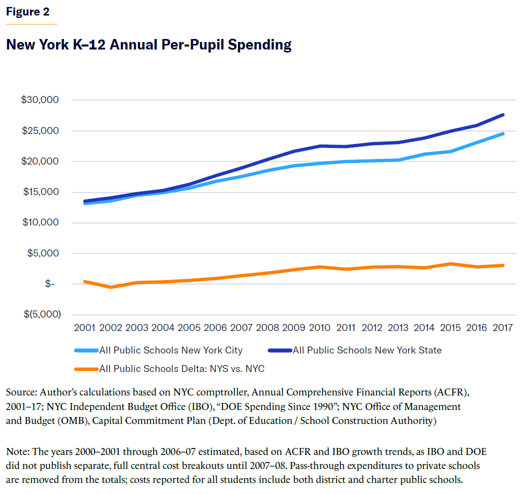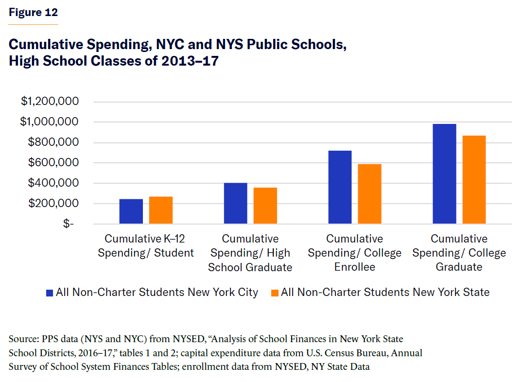 - New York’s public school systems do not lack financial resources. From kindergarten through high school, New York City on average spent nearly $400,000 per student in current dollars, or approximately $30,000 per year for the 2013–17 traditional high school cohort examined in this report.