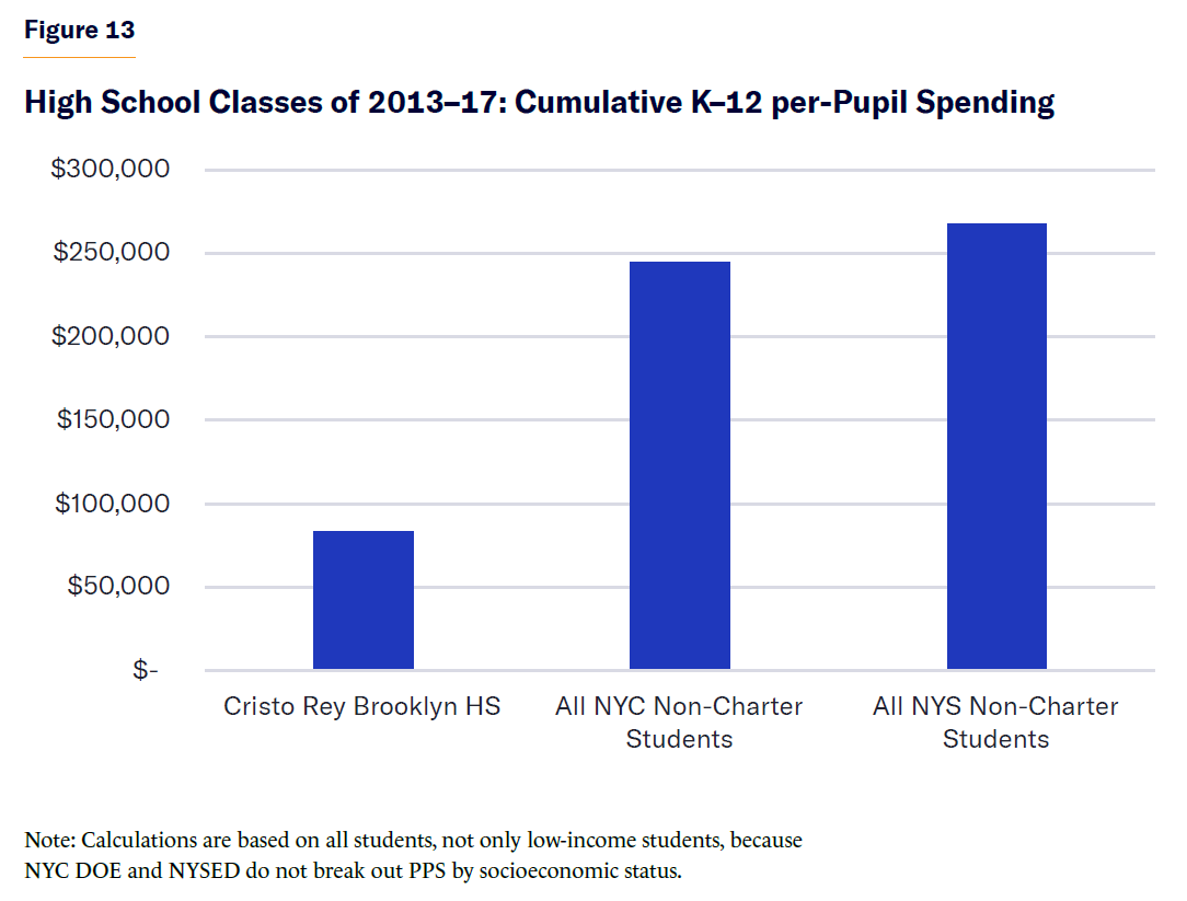 - The value that is actually realized by New York public school taxpayers and students assumes greater salience when comparing New York public school systems with one NYC private school alternative, which, at the secondary level, exclusively serves families of limited economic means: six times the number of college graduates for the same funding as NYC district public schools, a multiple that grows to nearly nine times when comparing low-income students only.