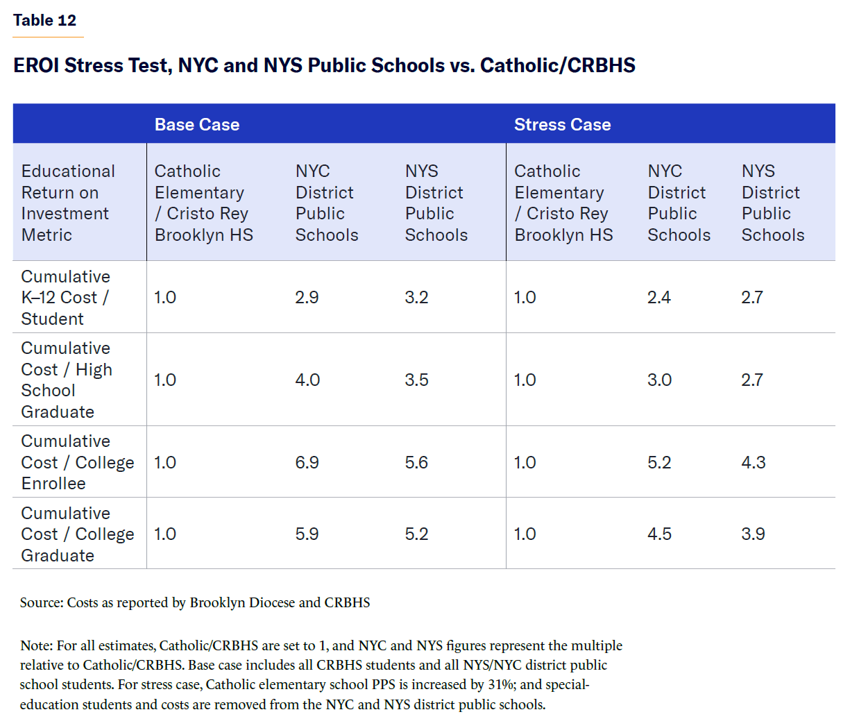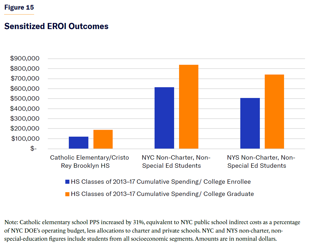 To extend the analysis beyond the public school domain, this study also examined the EROI performance of one NYC private high school (Cristo Rey Brooklyn HS) and one feeder elementary school system (Diocese of Brooklyn and Queens), including a comparative analysis with their public school peers.