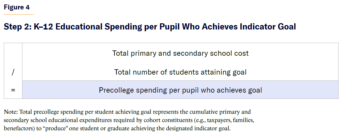 - Spending per academic performance indicator: Expressed as a dollar amount, this metric is computed similarly to PPS. It measures the cumulative dollar amount expended by a school, district, or network over a 13-year period (K–12) to achieve specific baseline or target objectives for a single student. (No postsecondary, higher-education expenditures are included in this calculation and its output.) Unlike PPS, however, which is a function of primary and secondary school enrollment, these metrics incorporate actual academic performance, as reflected by specific key success indicators, to yield straightforward measures of institutional performance. These metrics are further broken down to capture the cumulative expenditures required to matriculate, enroll, persist, or graduate a single student from elementary school through high school or college: