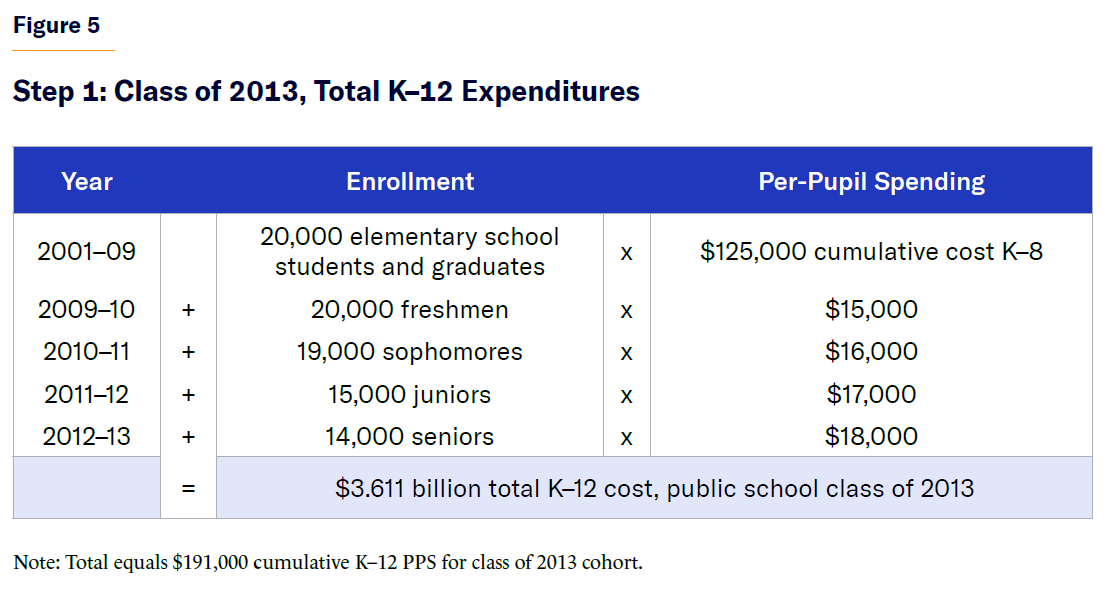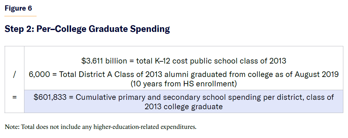In this hypothetical case, the District A public school system spent, on average, $191,000 per student in the high school class of 2013 from kindergarten through 12th grade. However, the cost to produce a single college graduate from that class was $601,833 over that period, yielding a multiple of more than three times the PPS.