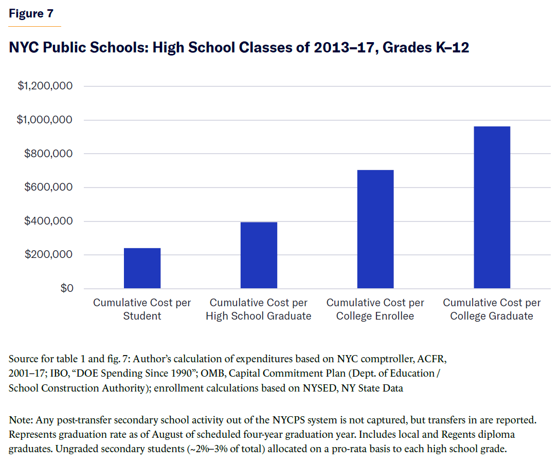 - The cost per college graduate in NYC public schools was $1 million in nominal dollars—four times higher than the average per-pupil K–12 cost. The cost per college enrollee was three times higher.