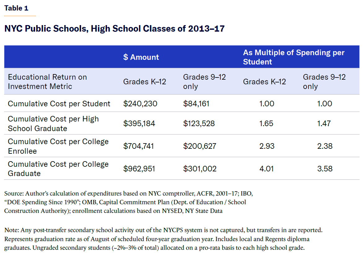 It cost $240,000, on average, to educate a student in primary and secondary public schools in NYC during this period. However, because only 57% of ninth-graders graduated high school by the August four years after their initial high school matriculation, the NYC public school system actually spent almost $400,000 to produce a single high school graduate.[15]