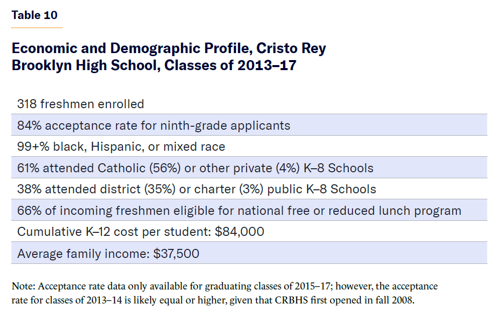 For these reasons, the combined Cristo Rey HS and Catholic elementary school systems offer a useful point of comparison for the other school systems analyzed in this report.