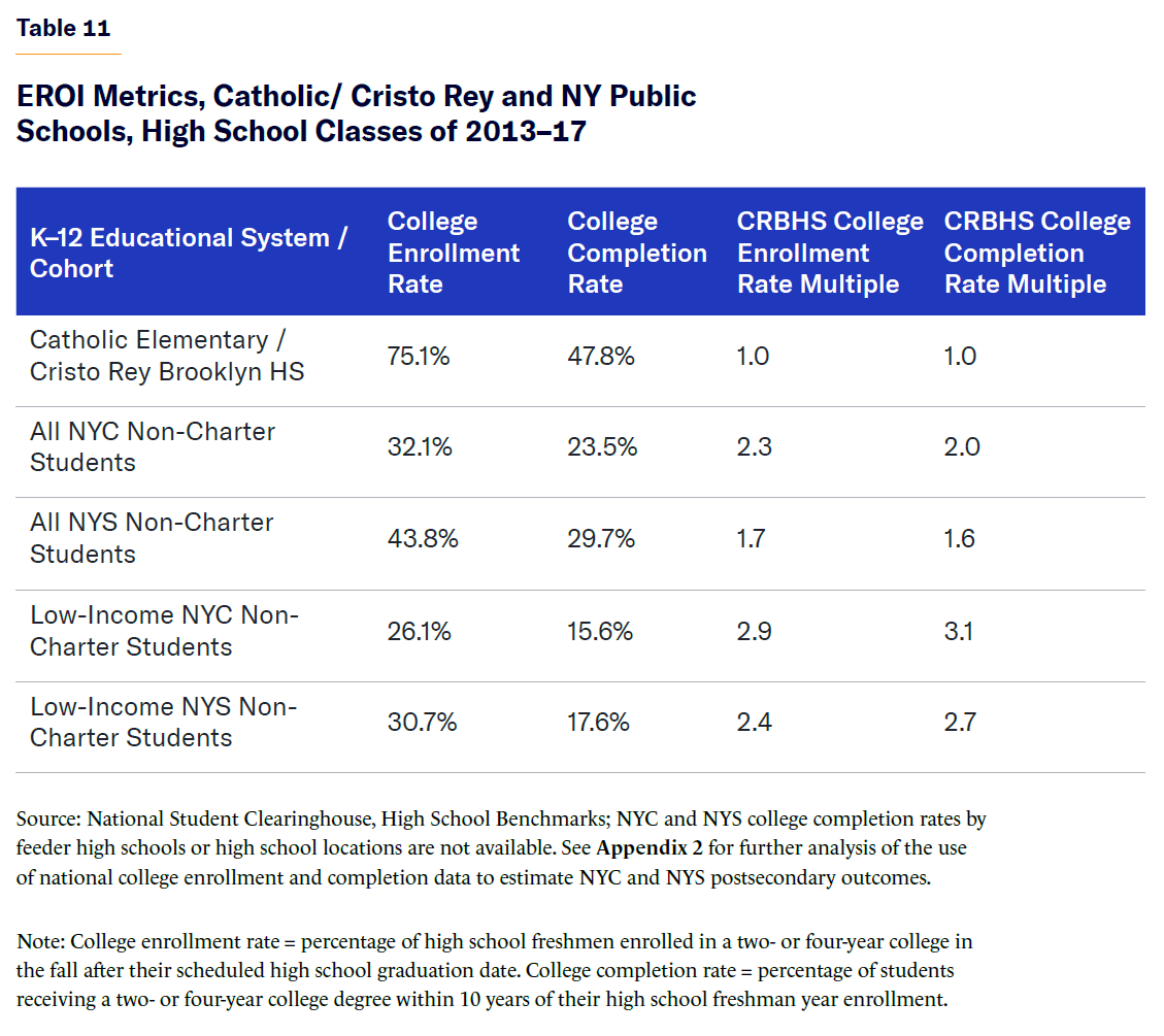 Noticeable differences exist between these two models in terms of postsecondary educational performance (without incorporating any spending criteria or results). Depending on the school location (NYC or NYS) and socioeconomic cohort (all students or low-income only) with which it was compared, the Catholic/ Cristo Rey model performed 1.6–3.1 times better than its public school counterparts (Table 11).