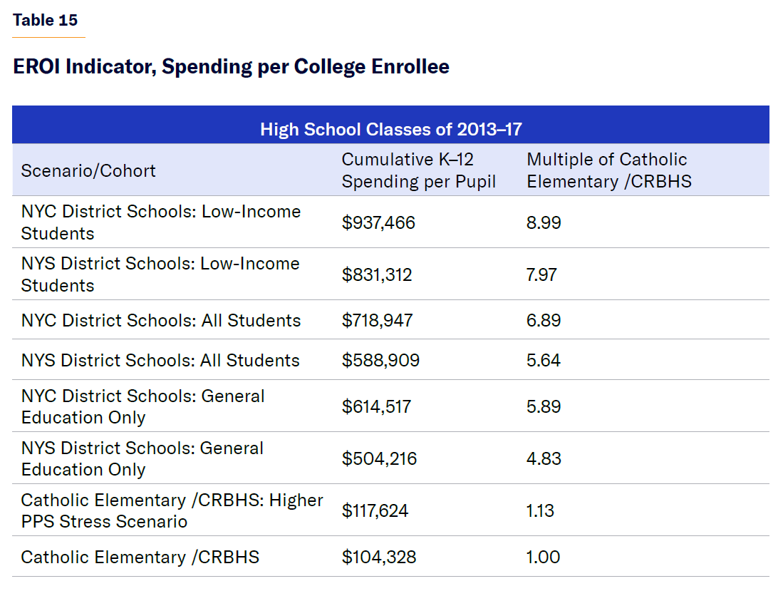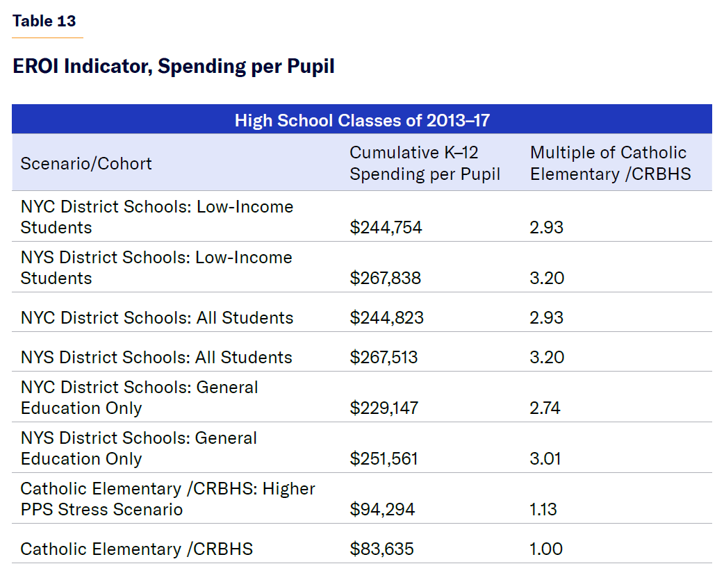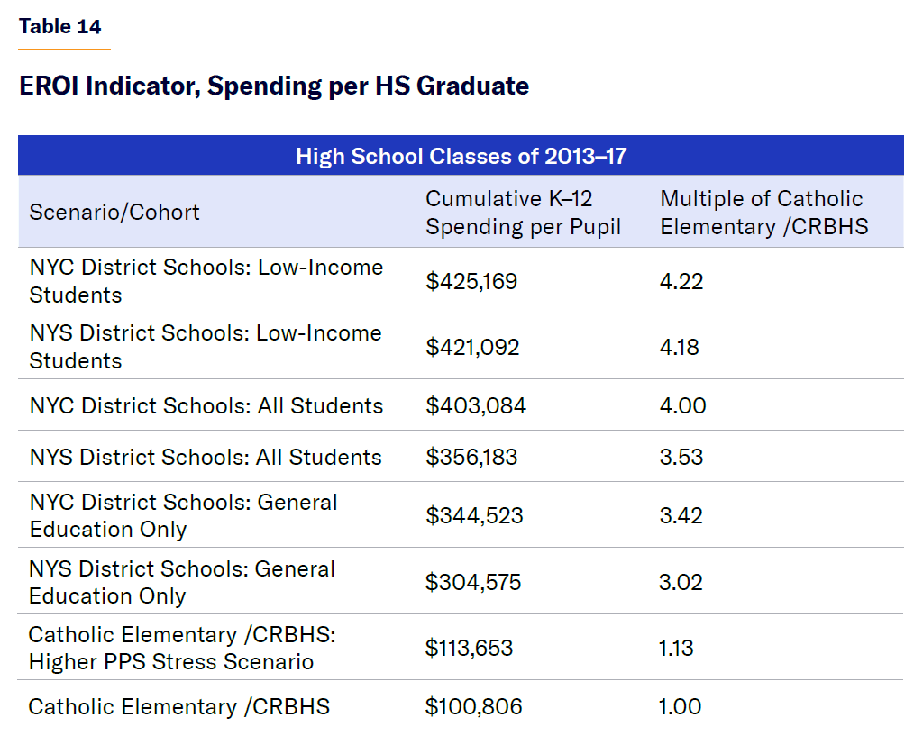In terms of cumulative K–12 PPS alone—without incorporating academic performance—the cost of educating the high school graduating classes of 2013–17 in NYC and NYS district public schools was 2.9–3.2 times higher than the cost of doing so in the combined Catholic elementary school /CRBHS alternative (Figure 13). In terms of cost per high school graduate, NYC and NYS schools spent 4.2 times more than the Catholic school /CRBHS system.[31]