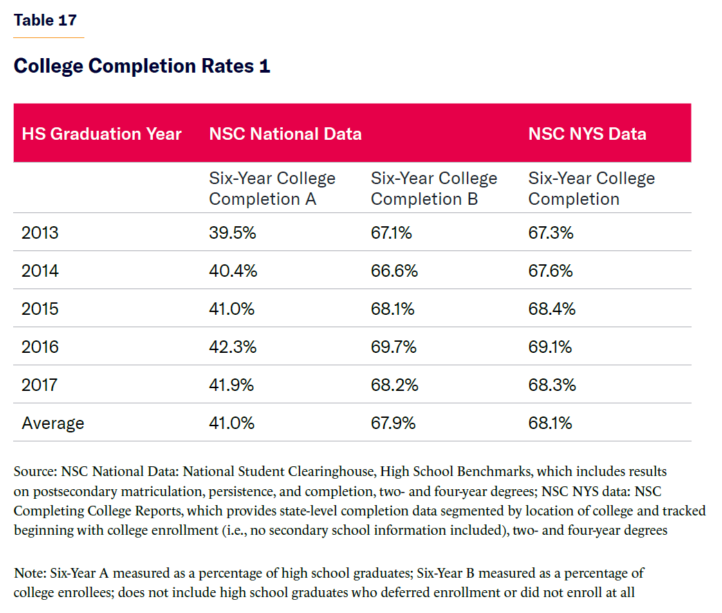 - College completion rates, NYC and NYS high school graduates: Defined as the estimated number of NYC and NYS public high school graduates to complete college, either two- or four-year, within six years of high school graduation and 10 years of high school inception; based partly on the national results from the National Student Clearinghouse (NSC) High School Benchmark Reports.[33] To test the reasonableness of employing national data as a tool to credibly estimate NYC and NYS results, the following comparisons and calculations were studied or conducted: