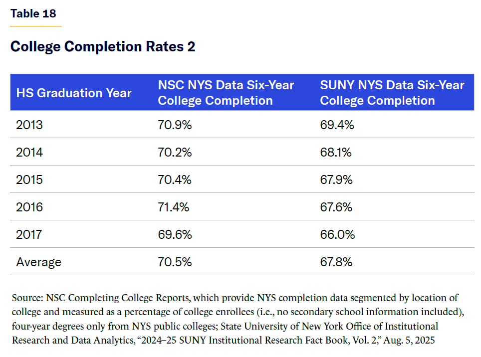 - NSC Yearly Progress and Completion Report tracks college persistence and completion from the time of initial college enrollment (vs. secondary school enrollment or graduation) and provides state-level college matriculation and completion statistics based on college state of domicile, not the student’s home or high school address. However, because a very high percentage of NYS college students are also NYS residents (e.g., during 2014–24, 94%–97% of students in the State University of New York [SUNY] system were NYS residents[34] ) these NSC-reported data serve as a useful, if imperfect, check. Reported higher-education completion rates from these two separate but related sources and methods yielded nearly identical results, as seen in Table 17.