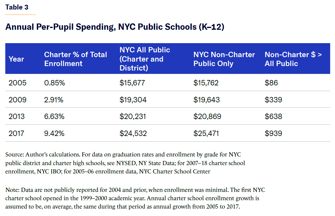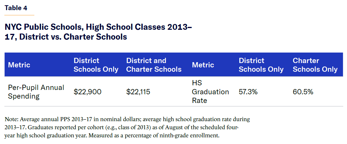 Table 4 shows the gap between district and charter schools in average annual cost and high school graduation rates for 2013–17. Given that charter schools have since grown significantly, to 15% of the total NYC public school population, these gaps have likely grown, and will continue to do so.