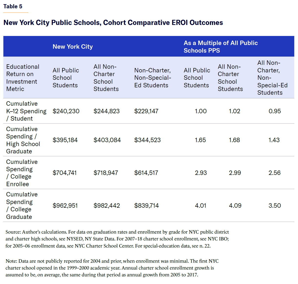 A personal financial investment that results in a 10% ROI might seem like cause for celebration—unless that money could have gone to other investments, with similar cost and risk, that yielded 15%. Although the EROI framework can be useful in assessing a particular K–12 school, model, or system, it is even more useful as a means of comparing outcomes across several institutions, districts, and networks. Therefore, in addition to the NYC public school system, this report also presents an EROI analysis for New York State as a whole as well as for one private/parochial school system in New York City.