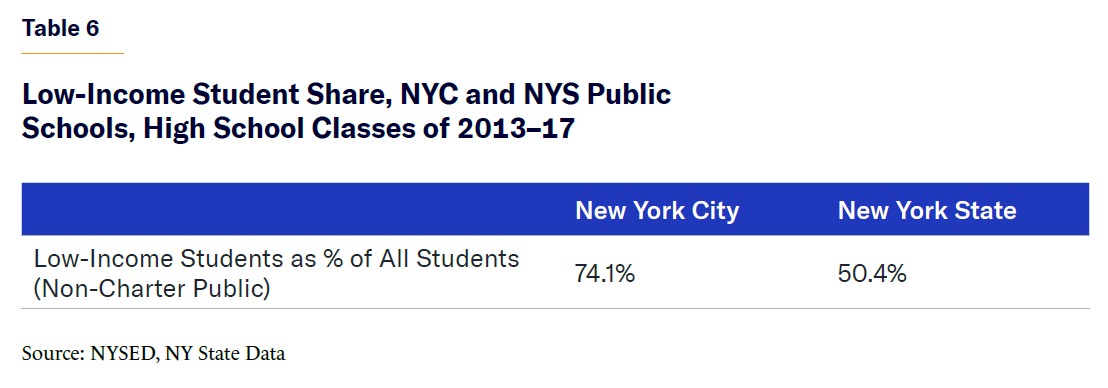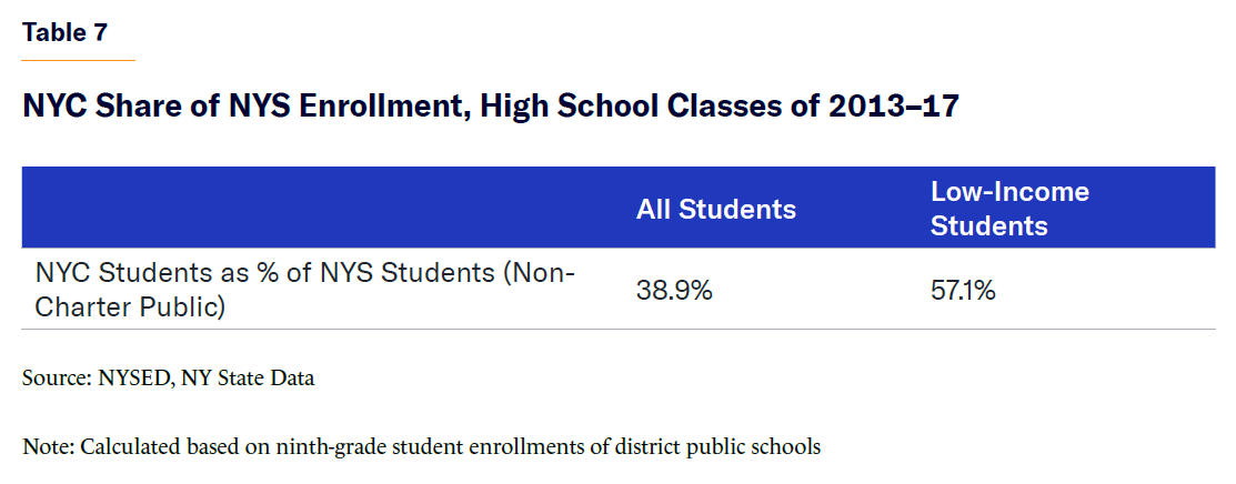 The city’s performance on these metrics can largely be explained by the fact that NYC has a higher concentration of low-income students relative to NYS as whole; and NYC’s share of statewide low-income students is noticeably higher than its percentage of overall enrollment (Tables 6 and 7).