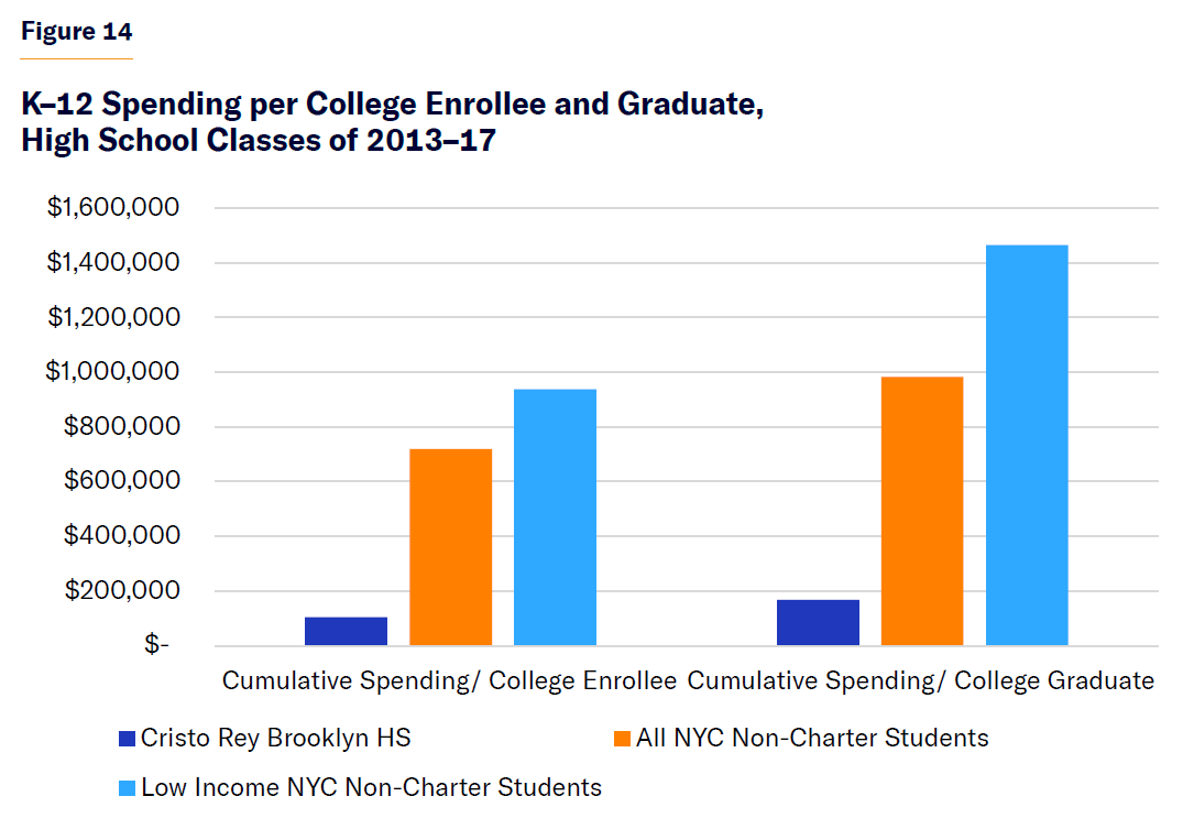 To produce one college graduate within six years of high school graduation from a pool of low-income students, Cristo Rey Brooklyn and Catholic elementary schools spent only $167,000, while the NYC traditional public school system spent $1.47 million ($2.2 million, 2025$) (Figure 14). This translates to a CGM of 8.8, i.e., for the same investment, the Cristo Rey model yielded approximately nine graduates versus NYC public schools’ one graduate.