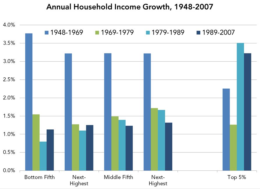 For income growth between 1948 and 1969 for the bottom 80 percent, estimates come from Economic Policy Institute tabulations of data from the Census Bureau’s Current Population Survey. The figures indicate annual change in the family income of families (rather than the family income of individuals). Household income data only go back to 1967, and while family income growth was probably stronger than household income growth from 1948 to 1969, using the former as a proxy for the latter is unlikely to distort the basic trend. “Income” includes cash transfer income from federal programs (such as Social Security, Unemployment Insurance, Supplemental Security Income, and Temporary Assistance for Needy Families) but does not include non-cash benefits from employers or government (such as health insurance, food stamps, or housing subsidies). These sources of income were relatively unimportant prior to the 1970s; Medicare and Medicaid were enacted in 1965 and the food stamp program expanded nationally only in the early 1970s. Incomes are measured before taxes. See Economic Policy Institute (2012). “Mean family income, by income group” [data table]. The State of Working America. Washington, D.C.: Economic Policy Institute.