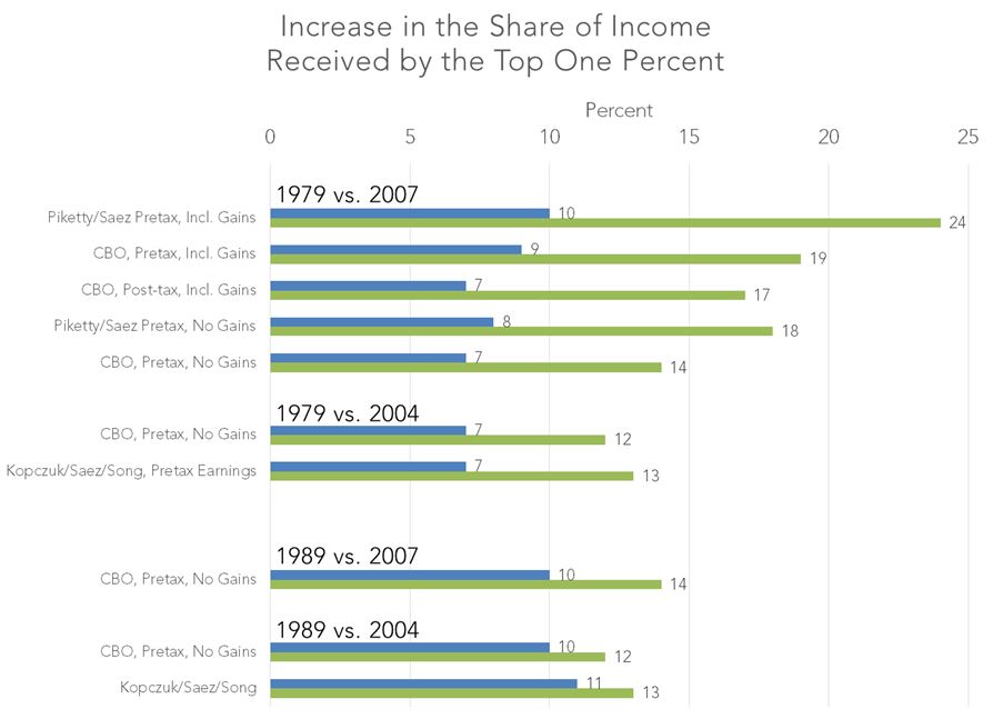 It found that the share of income received by the top five percent fell between 1989 and 2007. The CBO pretax estimates after excluding capital gains suggest an increase from just 10 percent to 14 percent over this period. Saez’s estimates for earnings show an increase from 11 percent to 13 percent from 1989 to 2004.