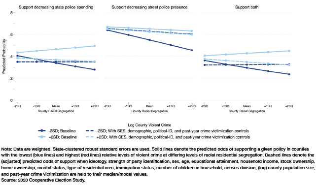 The results are shown in Figure 10. First, we see that the odds of white Democrat support for decreased state police spending are indeed somewhat greater in high-crime counties with relatively high degrees of residential segregation and lower in high-crime counties with relatively low degrees of residential segregation. For instance, a white Democrat in a county that is +2SD on the county violent-crime index and +2SD on the county segregation index is estimated to have a 49.4% chance of supporting defunding. In contrast, in counties with the same level of crime (+2SD) but that fall two standard deviations below the mean of the segregation index, the odds are 43.4%. This 6-point difference, however, is not statistically significant (p=0.423). Moreover, the same pattern of results is even less evident in the remaining two outcomes.[24] Finally, as shown in the bottom three panels of Figure 10, holding all socioeconomic, demographic, and political control variables constant eliminates virtually all differences in support between counties across the segregation index.