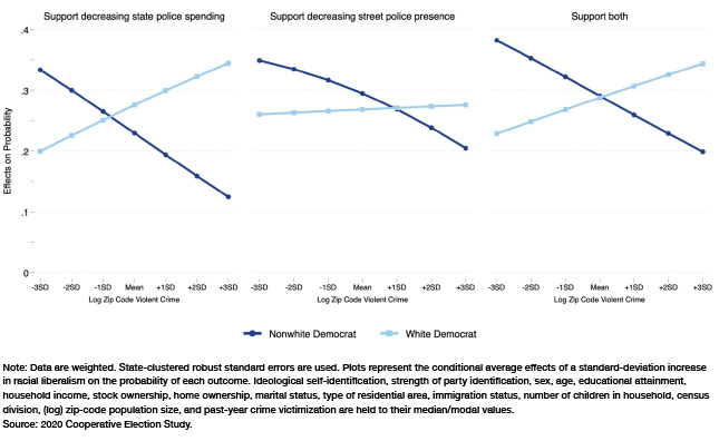 In the end, the above predictions were generally borne out in the data. For all three policy outcomes, the effects of racial liberalism on white Democrats’ likelihood of endorsement become stronger—and, for two of these outcomes, significantly so—with increases in local violent crime. The effects of racial liberalism on nonwhite Democrats’ odds of endorsement consistently shrink as local violent-crime levels increase—a pattern that holds for each of the three racial/ethnic groups under study. Though matched on all control variables, the effects of racial liberalism on endorsement in high-crime areas were always stronger (and generally significantly so) for white than for nonwhite Democrats. Though by no means dispositive, these findings suggest that white Democrats continue to support defunding and depolicing policies even in high-crime areas in part because of a “privilege conscious” or “white savior” moral ideology, which constrains self-interested policy preferences and promotes those that are perceived to protect or benefit blacks and other marginalized people of color.