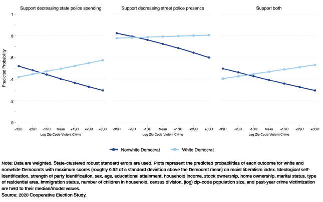 Unfortunately, a complete test of this theoretical account was not possible with the current data. However, this account suggests that group-based moral pressures (collective shame and guilt) are more necessary for defunding and depolicing policy support in high-crime areas, and measures of some of these moral constructs significantly overlap with available measures of racial liberalism. Thus, we predicted that the effects of racial liberalism on white Democrats’ support would strengthen as local violent-crime levels increase. For nonwhite Democrats, on the other hand, these moral constructs do not carry the same personal moral significance or constrain preferences—racial liberalism does not implicate themselves or their ingroups in moral wrongdoings and, therefore, does not impose a moral duty to correct them. Accordingly, for nonwhite Democrats, the effects of racial liberalism on support for defunding and depolicing policies were expected to weaken in residential areas with relatively high levels of violent crime. Finally, and following from these two divergent predictions, the effects of racial liberalism on support in high-crime areas were expected to be significantly stronger for white than nonwhite Democrats.