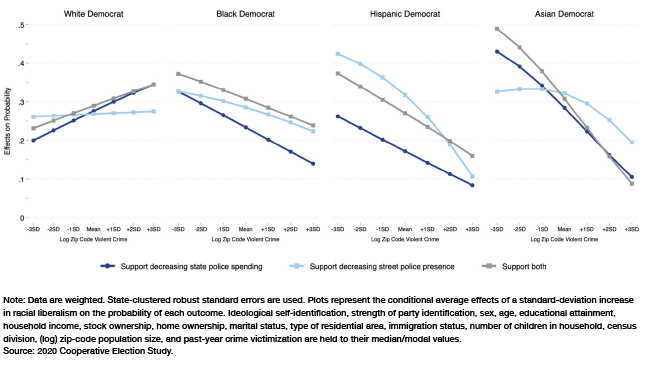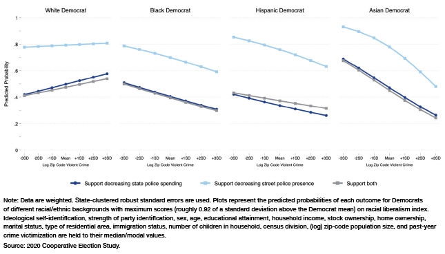 This report ultimately finds support for both the SES- and ideology-centered accounts. In the main, both socioeconomic variables and ideology independently influence the likelihood of supporting defunding and depolicing policies, though the latter is relatively more important than the former. Further, whereas socioeconomic variables account for higher levels of support among Asians relative to black and Hispanic Democrats, ideology matters more for differences in support between the foregoing groups and white Democrats. Finally, and quite remarkably, local violent-crime levels significantly reduce support among nonwhite Democrats but have no effect, to significantly positive effects, on support among white Democrats. This discrepancy is not explained by conventional socioeconomic, demographic, and political background variables. Instead, the data indicate that white Democrats’ defunding and depolicing attitudes are powered by a unique group-based (or “privilege conscious”) moral ideology that boosts their support for such policies in high-crime areas.