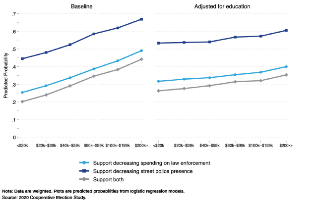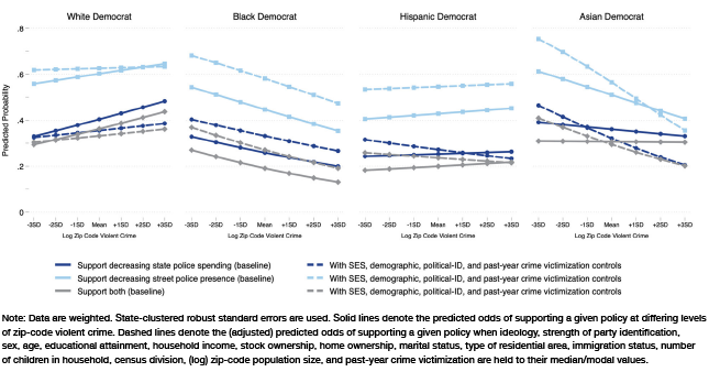 By this account, socioeconomic status (SES) and material security are central enablers of pro-depolicing attitudes. First, those of higher SES are more likely to live in low-crime areas. Second, should they be victimized by crime, they are more likely to have the resources and support system to recover.[8] Taken together, Democrats of higher SES are better able to avoid or afford the consequences of defunding and depolicing policies.