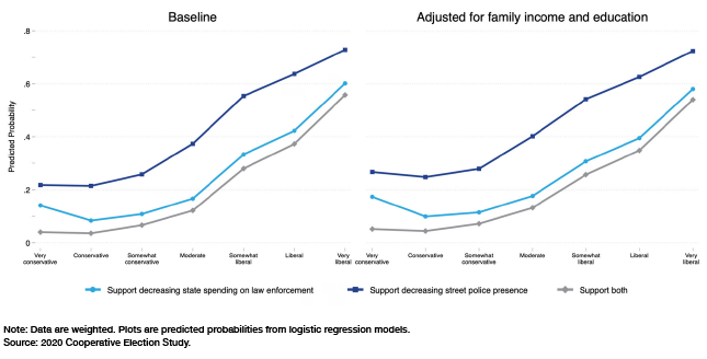 But what if the role of socioeconomic status is overstated, and these beliefs are in fact the product of moral-political ideology? On this view, people support defunding not because it is a status marker but because they genuinely believe it is “the right thing to do” in the face of “rampant” police racism. Beliefs grounded in moral conviction or “sacred values”[9] may be less sensitive to considerations of material self-interest, so we might expect such individuals to maintain their support for depolicing even when it entails personal risk. Their ideological beliefs may lead them to place little weight on these policies’ unintended negative consequences. And if they do consider them, they are likely to downplay or rationalize them as morally necessary. By this account, material security is incidental rather than instrumental to the expression of pro-depolicing attitudes. Wealthier individuals may be more inclined to express them not so much because they are better able to “afford” the policy costs but because they are more likely to espouse a moral-political ideology that is less sensitive to and/or justifies them.
